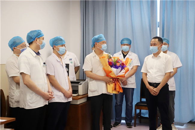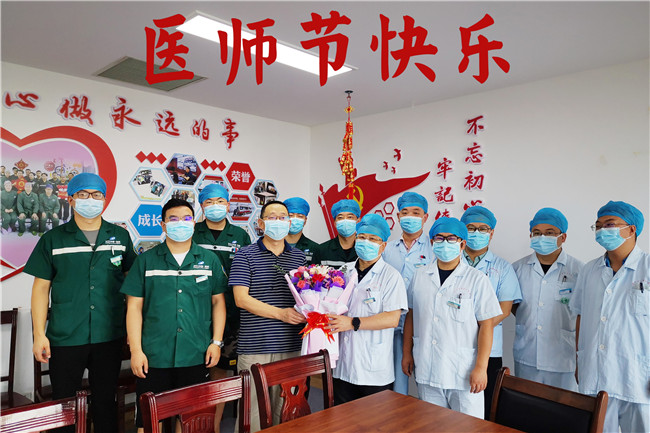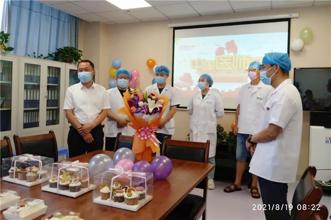 “今天是属于你们的节日,向大家致以最真挚的祝福!” “感谢你们的辛勤付出与奉献,你们辛苦了!”8月19日,为庆祝第四届中国医师节,一大清早,丹江口市第一医院党委书记曹通、院长姚振江、其他院领导及相关部门负责人一行分别来到各病区及隔离区,为奋战在一线的医师们送去鲜花,传递对白衣战士节日的慰问与祝福。