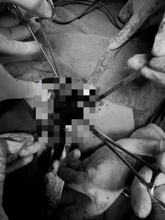 手术过程十分艰难,术中探查,见患者颈部有两处分别为5cm、10cm长的不规则伤口,大量血液呈喷射状不断从伤口涌出;向颈部左外侧延伸手术切口,进一步探查,发现颈前肌群及左胸锁乳突肌横断,左侧甲状腺上动脉断裂,甲状腺左侧叶及峡部横断,其中一处伤口过深,造成左颈总动脉有一约0.8cm破裂口,大量喷射状出血使得创伤区解剖层次模糊不清,创面显露困难。