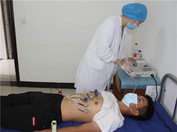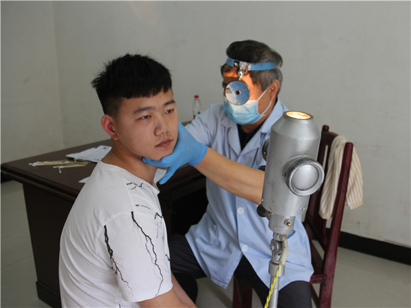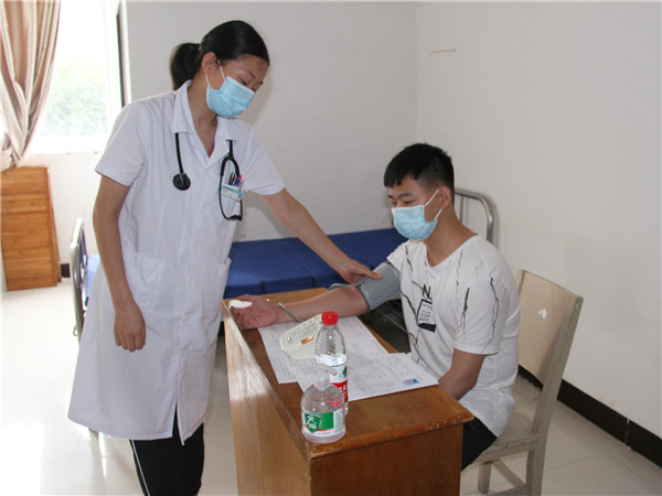 在医院外墙上,“2020年丹江口市征兵体检站”的横幅标语格外醒目。大楼内,内科、外科、视力、听力、嗅觉、心理测试等各个基础项目的体检,根据疫情防控需求,分布在不同检查室内。所有医务人员佩戴口罩、帽子等,执行一级防护措施;应征青年们在工作人员的指引下保持着一米以上安全距离排队,依次有序入室体检。