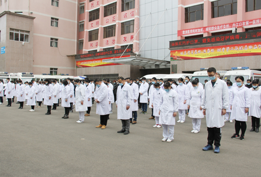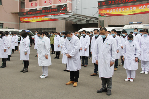 4日清晨,怀着悲痛之情,市一医院大楼前的国旗降半旗,向抗击新冠肺炎疫情斗争牺牲烈士和逝世同胞致哀。上午10时,随着全市防空警报的响起,全体医务人员、来院就诊患者及家属全部肃立默哀。院领导及科室代表全部自发参加了在医院广场国旗下举行的默哀仪式,现场气氛感染了路边的行人,他们也一同加入到了默哀行列中。在这短短的3分钟,汽车鸣笛声、警报声与哀婉的啜泣声交织在一起,向所有的遇难同胞们送去祝福,愿他们一路走好。