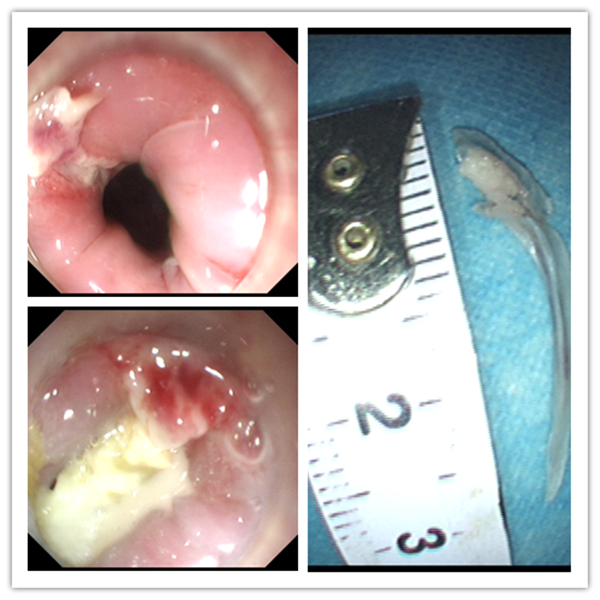 在给患者做了血常规、胸部CT以排除心冠病毒感染后,4月7日消化内科迅速为任某某办理了住院手续。当天下午,一切准备就绪后,在麻醉医师伍星的配合下,通过胃镜,在食管上段发现了“罪魁祸首”--一根约为3cm的三角棱锥弓形鱼刺,其中一端已穿透食管壁,并有感染现象的发生,情况十分危险!李又春小心谨慎地操作着,在助手医生和麻醉医师的默契配合下,最终将鱼刺顺利取出,患者转危为安。但由于该患者食管穿孔,术前耽误时间较长,存在损伤出血和感染等风险,目前正在进行胃肠减压及制酸、抗感染药物等康复治疗。
