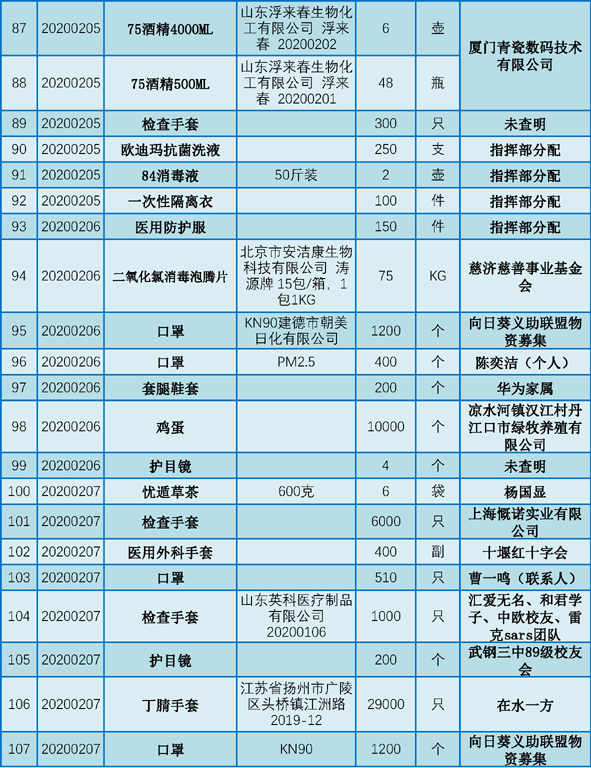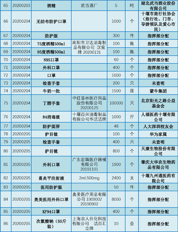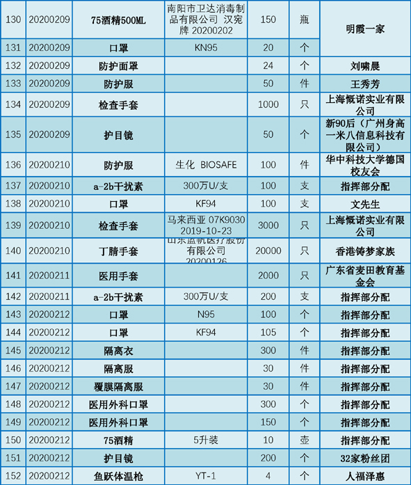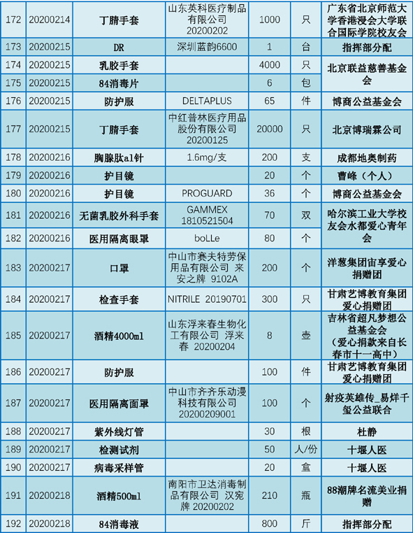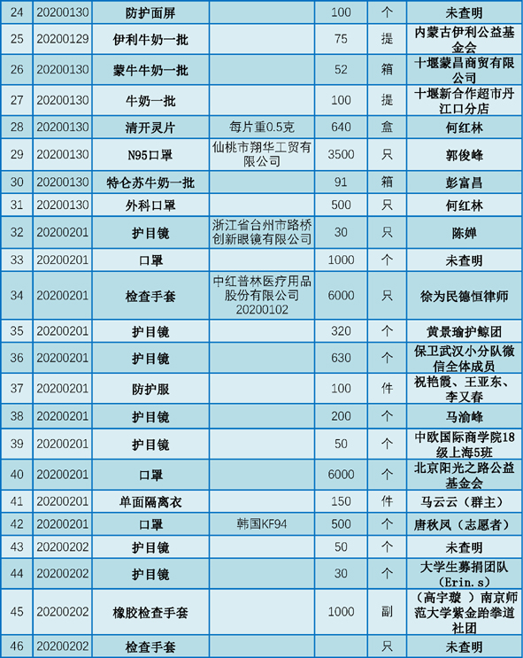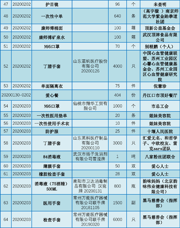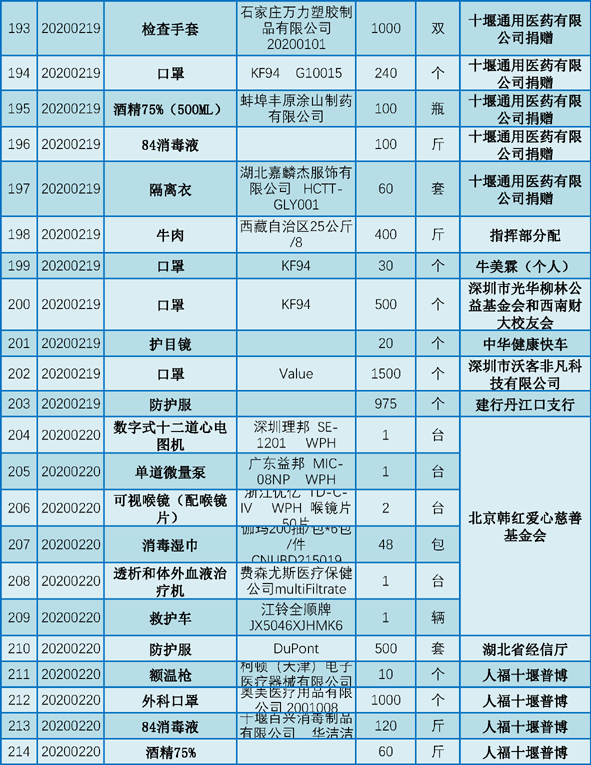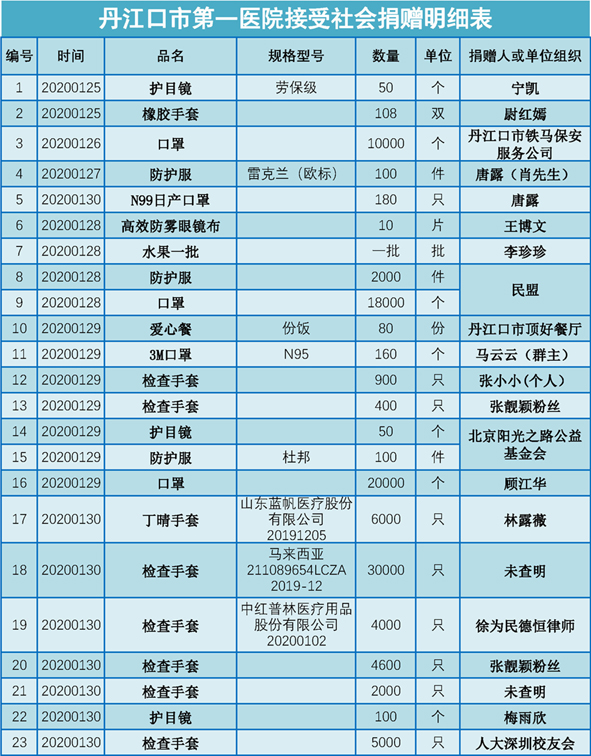 丹江口市第一医院受赠物资公示表(2020.01.25-2020.02.29)
