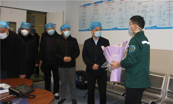 1月25日农历正月初一一大早,我院领导盛波、姚振江等陪同市卫健局领导深入各科室,向春节期间仍坚守在工作岗位和奋战在疫情防治一线的广大医务人员致以节日的问候!领导一行还仔细询问了各科室病人收治情况,叮嘱大家积极做好个人防护,勉励大家要众志成城,共抗病毒,相信通过全市人民和广大医务工作者的共同努力我们一定能够战胜疫情!