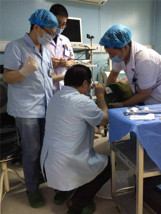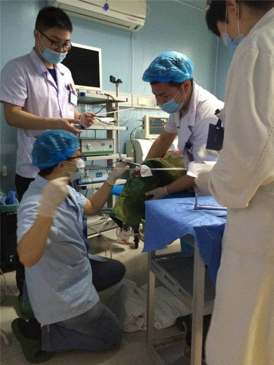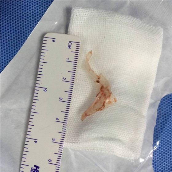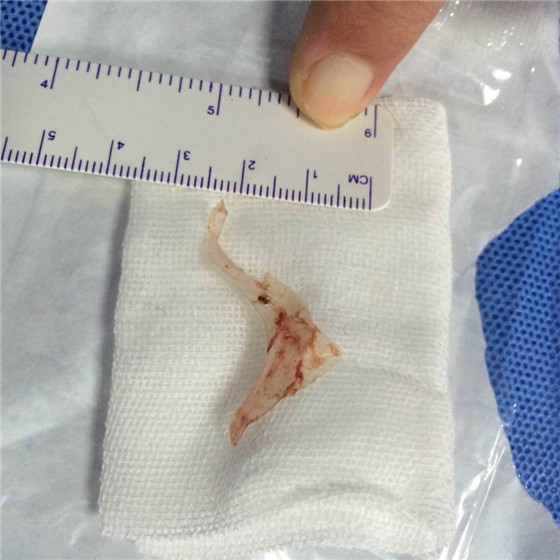据了解,58岁的岳大娘,家住丹江口市习家店镇,1日晚9时左右在家用餐吃鱼时,喉咙被卡,家人本以为是鱼刺,便食用青菜试图下咽。几经尝试,感觉鱼刺越卡越深,至咽喉疼痛,吞咽困难。凌晨1时左右被家人急送至该市第一医院就诊,CT检查示食管异物。2日上午,在该院耳鼻喉眼科手术室,科主任张达清、主治医师胡大山轮流上阵,蹲跪近半小时,通过食管镜成功取出一片弓形腮部鱼骨。