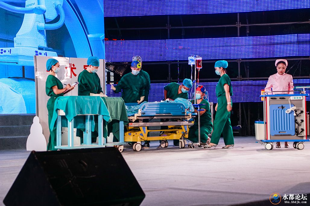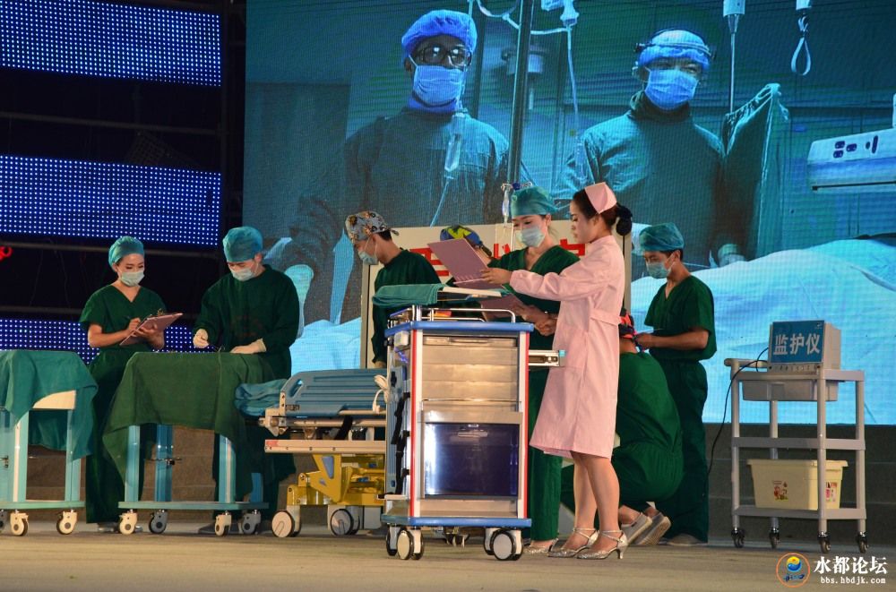 19时30分,由我院表演的舞蹈《幸福花开》正式拉开了晚会序幕,市公安局女子交警队表演的《交警手势操》和我院表演的情景剧《天使之爱》将现场气氛推向了高潮。剧中围绕一位胎盘早剥大出血的产妇被紧急送入手术室抢救为主线,准备呼吸机、抢救药物、气管插管、心电监护……展现了医护工作者马上投入紧张抢救的工作常态。伴随着一声响亮的婴儿啼哭声,主持人用颤抖的声音说出母子二人转危为安时,现场观众们无不鼓掌叫好。演员们最后通过时装秀的形式展示了自行设计的用一次性材料与手术器械搭配在绿色手术单设计的服饰,在舞台上向大家展示出不同于工作时的飒爽英姿,生动展现了医务工作者们艰苦奋斗、乐于奉献、爱岗敬业的良好精神风貌。