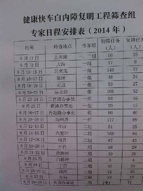 为了将这一造福于山区贫困白内障患者的民心工程落到实处,省、十堰市卫计委及我市市委、政府高度重视,市政府组织成立了以市长李翔为组长,副市长马力任副组长,相关成员单位负责人为成员的项目领导小组。整个项目分宣传发动、调查摸底、病员筛查、项目实施4个阶段。自8月4日项目启动大会召开以来,各乡镇办事处、林区政府及卫生院积极发动村组干部、乡村医生进行宣传动员及调查摸底,市一医院作为基地医院及时成立专家组,积极开展白内障筛查培训和技术指导,并抽调眼科专家组建两个筛查小组,分赴江南、江北各乡镇办事处、林区,集中开展白内障患者筛查。