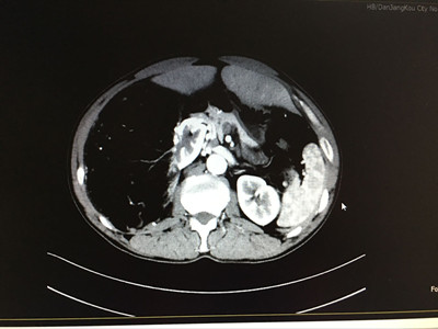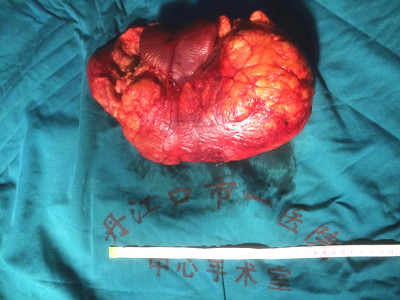 两位患者均为体检时发现后腹腔有一巨大占位,进行详细检查发现肿瘤。据患者介绍,平常并无特别明显症状。其中一名患者为右肾错构瘤,属血管平滑肌脂肪瘤,长25公分,宽16公分,厚13公分,与肝脏、肾动静脉和腔静脉粘连紧密,并将腔静脉挤弯变形、推向左侧。和右肾连在一起有半个足球大小。另一名患者为左肾透明细胞癌,直径21公分左右,囊实性占位病变,与胰腺粘连紧密,肾血管受挤压位置变异。