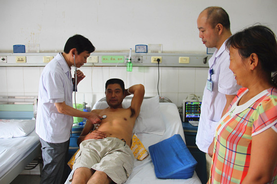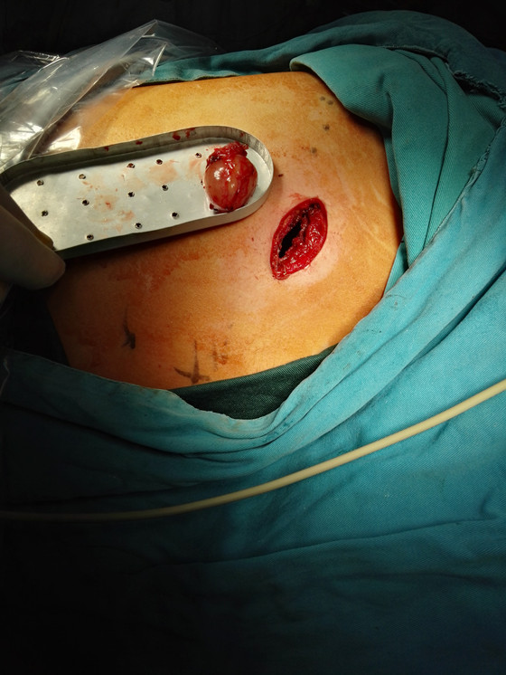44岁的凉水河镇农民王某,因胸部不适来丹江口市第一医院做胸部CT检查,发现右侧胸膜下有一个5cm大小的肿瘤。需要手术住院治疗,遂入住该院普胸外科,经过周密计算,8月16日高玉宝主任带领李峰、朱黎明两名医生对患者实施了单孔胸腔镜下右侧胸膜肿瘤切除手术。三名医生在患者右侧腋中线第4肋间位置开了一长约5.0cm的切口,术中通过该切口完整切除肿瘤。手术历时30分钟,出血少、手术顺利。