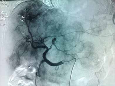 肝动脉分支血管增多、增粗,实质期肝脏可见多发大小不等结节状肿瘤染色