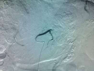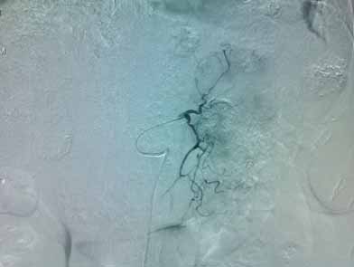 胃左动脉超选择造影见肿瘤血管增多、杂乱,示块状肿瘤染色