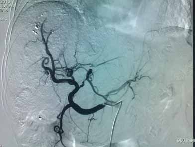 近日我院影像科又完成一例胃癌肝脏多发转移肿瘤联合介入手术,患者,男性,65岁,发现胃癌肝脏多发转移3月余,复查CT提示肝脏多发转移性肿瘤,最大的肝脏转移肿瘤有6cm,经影像科崔凯医生与肿瘤科汤建军医生分析讨论病情后决定采用介入化疗栓塞手术,在DSA血管造影机分别进行了胃左动脉、肝动脉化疗栓塞,术后患者恢复良好,精神和饮食较术前有明显改善。