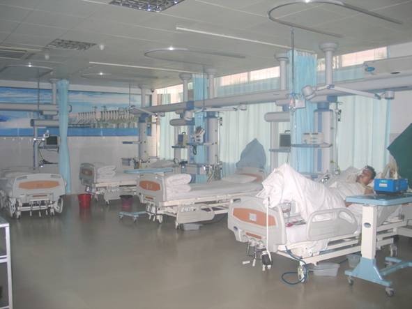 我院ICU成立于2007年,属综合性重症监护病房,目前设置床位12张,配备有空气层流净化设备、中央监护、病人监控探视系统、呼吸机、纤支镜、床边CRRT机、临时心脏器等先进设备,能够对全院各种急危重病人如:各种复杂大手术术后、呼吸衰竭、多器官衰竭、各类中毒休克、胰腺炎、心脑管危重症、心肺复苏等提供有效的监护与治疗。