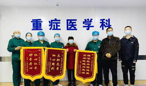经过一段时间的治疗,于某的病情得到了有效的控制,身体状况也一天天的好转,这让于某的家人看在眼里乐在心里,为了表达对市一医院急诊/重症医学科的感激之情,于某的家人在临出院之际向医护人员赠送了三面锦旗,感谢他们的救命之恩。 (急诊\重症医学科 熊亚丽供稿)