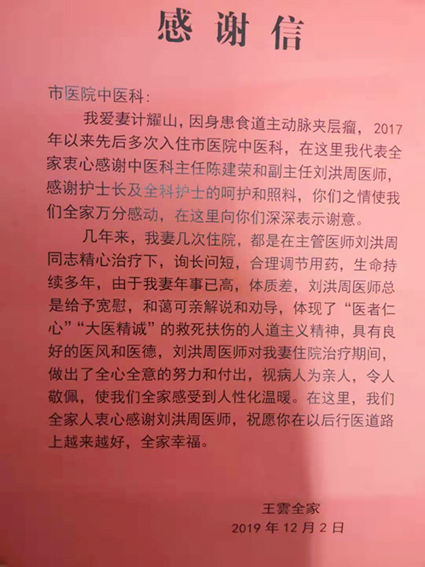 我爱妻计耀山,因身患食道主动脉夹层瘤,2017年以来先后多次入住市医院中医科,在这里我代表全家衷心感谢中医科主任陈建荣和副主任刘洪周,感谢护士长肜均及全科护士的呵护和照料,你们之情使我们全家万分感动,在这里向你们深深表示谢意。
