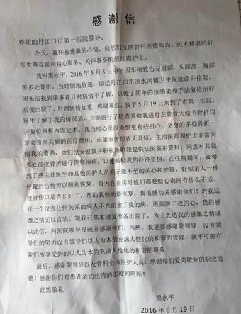我叫黑水平,2016年5月5日中午因车祸伤至左肩膀,头号面部,胸部等多处骨折,当时倒地昏迷,即送丹江口市凉水河镇卫生院就诊并住院,因无法找到肇事者且对病情不了解,只做了简单的抗感染和复位治疗后便出院,后因病情加重,疼痛难忍,我于5月19日来到了市一医院,医生了解我的情况后,立即进行了检查并给我进行左肱骨大结节骨折切开复位钢板内固定术,我当时心里很恐惧更有些担心,全身的多处骨折一定会带来高额的医疗费用,而肇事者杳无音信,主治医师和护士非常同情我的遭遇,他们便安慰我并积极地给我提供法医鉴定资料,同意对其他多处部位骨折进行保守治疗,以便减减轻我的经济负担。在住院期间,我得到了燕主任和其他医护人员们无微不至的关心和护理,好似亲人一样使我的伤势得以顺利恢复。每天在查房时他们都要细心询问有什么不适、检查伤口是否长好了,帮助我做功能恢复,我很感动并感谢他们!对我这样一个没有任何关系的病人不光治愈了我的病,还温暖了我的心,我的感激之情无以言表。现我已基本康复准备出院了,为了表达我的感激之情谨以此信,向医院领导反映并感谢他们;当然,我更要感谢院领导,没有领导们的努力没有领导们以人为本的充满人性化的和谐的管理,就不可能有我们所享受到的以人为本的充满人性化的和谐的服务!