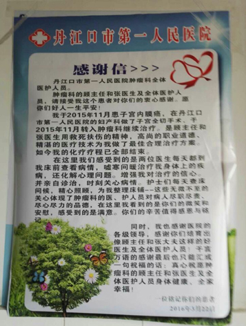 同时,我也感谢医院的各级领导,感谢你们培育出像顾主任和张大夫这样的好医生及全体医护人员!千言万语的感谢最后也只能汇成一句祝福的话:真心祝愿肿瘤科的顾主任和张医生及全体医护人员身体健康,全家幸福!